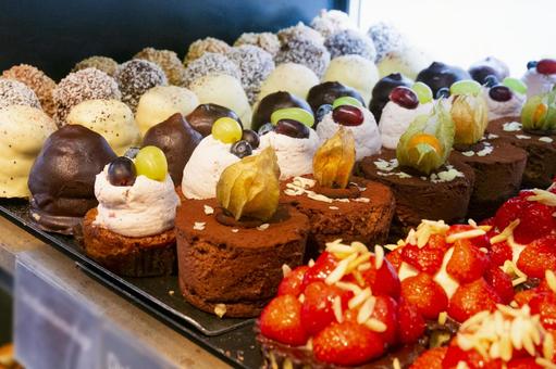 カフェの冷蔵ショーケースに並べられた美味しそうなケーキの写真・画像素材-Snapmart スナップマート。