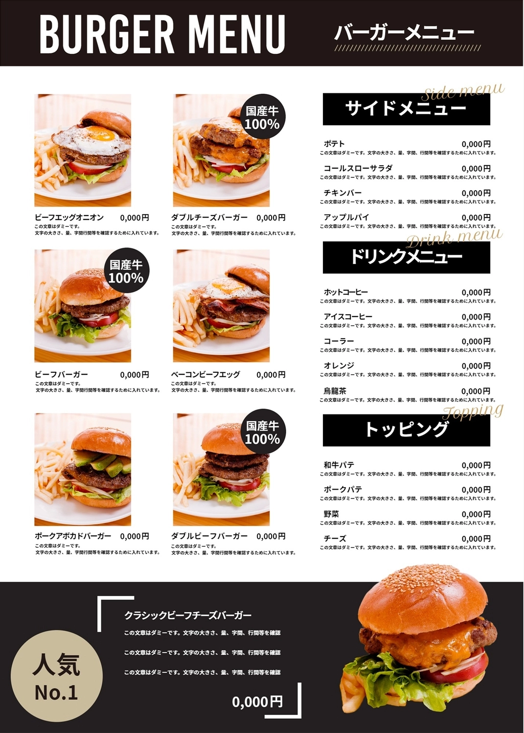 Free Menu template for ハンバーガーレストランのメニュー 3775 -Design AC。