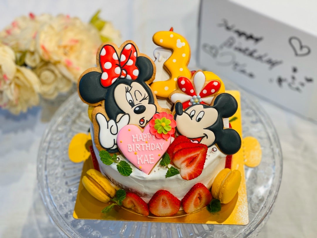 ミニーマウスとミッキーバースデーケーキとキャラクターの手法京都 アイシングクッキー作家『mikarinkoの食いしん坊日記』 ~cield'avenir~。