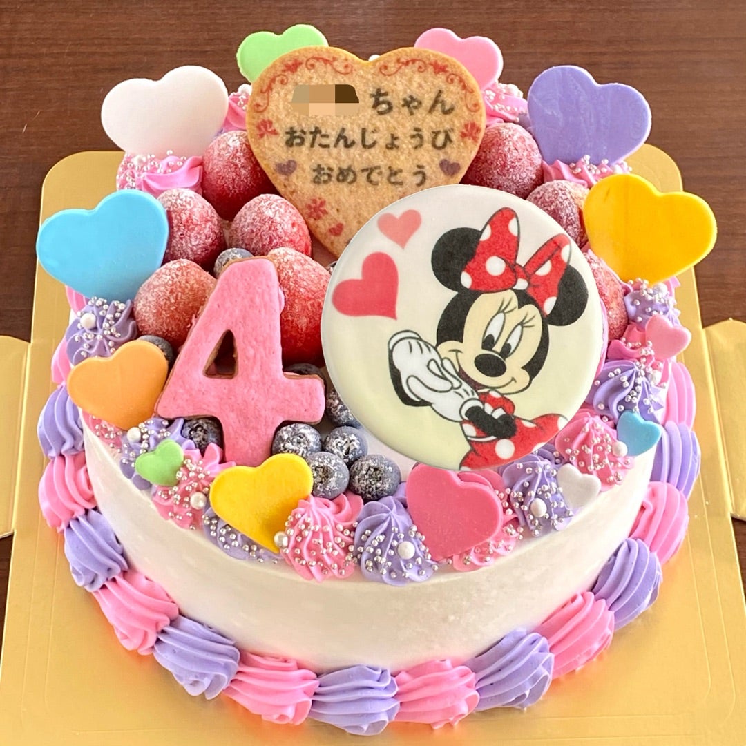ミニー&デイジーのイラストで、ピンク色のデコレーションケーキ。アレルギーっ子の夢を叶えるケーキ屋さん。