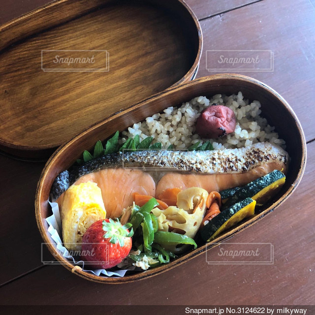 曲げわっぱに入っている鮭弁当を俯瞰で撮影の写真素材90310668- PIXTA。