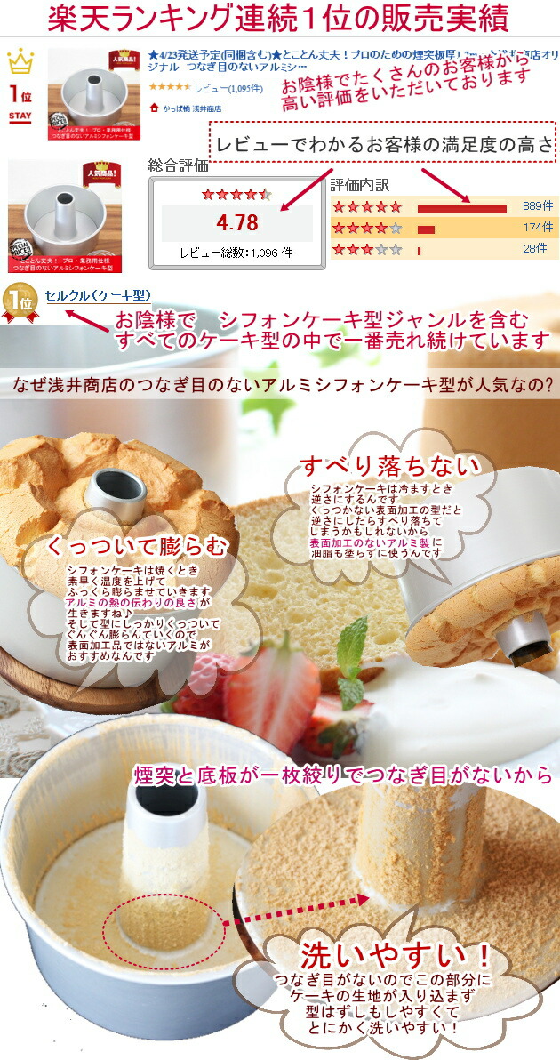 楽天市場 \10%OFFクーポン シフォンケーキ型 20cm 浅井商店オリジナル 「極厚シフォン」しっかり厚口つなぎ目のないアルミシフォンケーキ型20cm シフォン型 ケーキ型 手作り お菓子作り 焼き型 : かっぱ橋 浅井商店 製菓製パン道具。