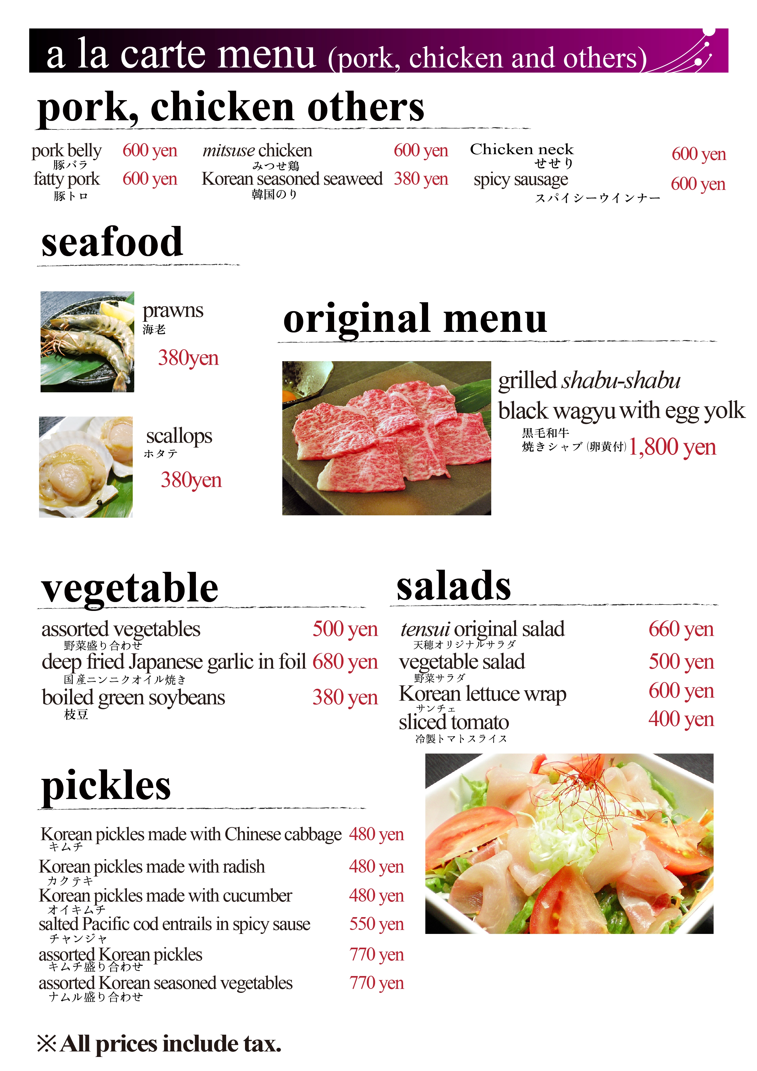 焼肉 英語版メニュー English Menu «焼肉メニュー小倉駅近郊「卸直営焼肉屋 肉処 天穂 てんすい 」。