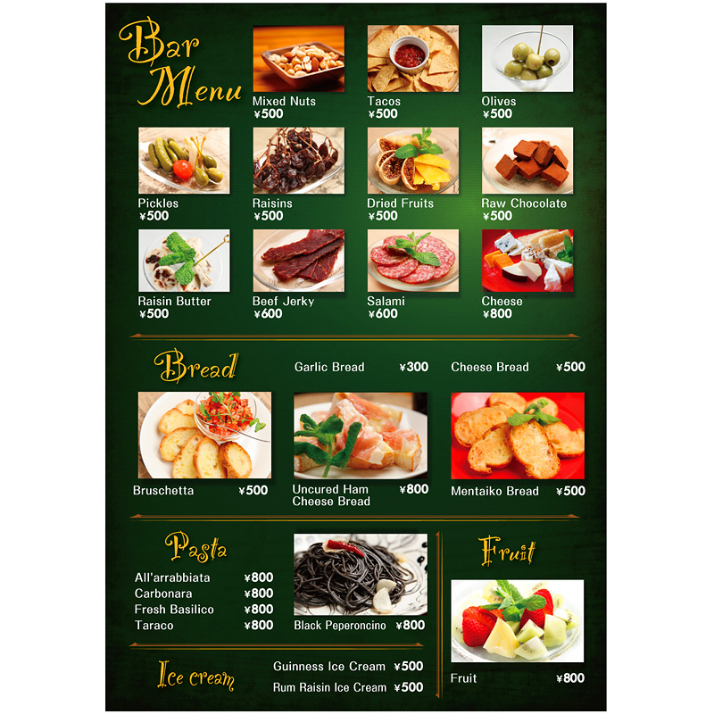 アイリッシュパブ アモンティラード 英語メニューfact works。
