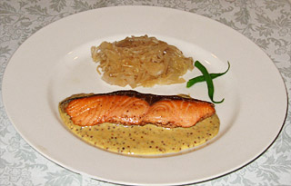 フランス料理 サーモンのポワレ!ムール貝を使った漁師風ソース。