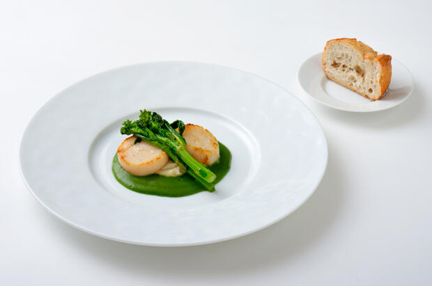 腎臓病食 フランス料理 ホタテ貝のポワレ 春菊のソース 菜の花添えレストラン・タニ家族と考える慢性腎臓病サイト 腎援隊。