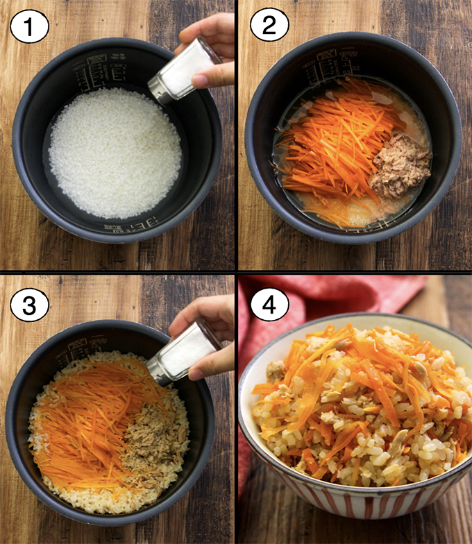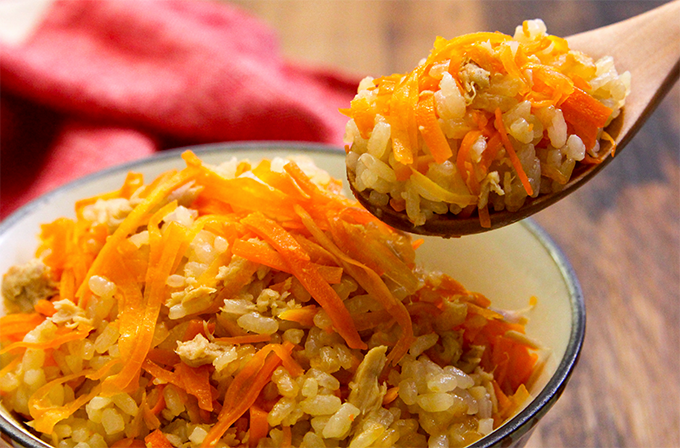 にんじんはすりおろして。ツナとにんじんの炊き込みごはん 2つの素材で炊き込みごはん・3kodomoe コドモエ —「親子時間」を楽しむ子育て情報が満載。