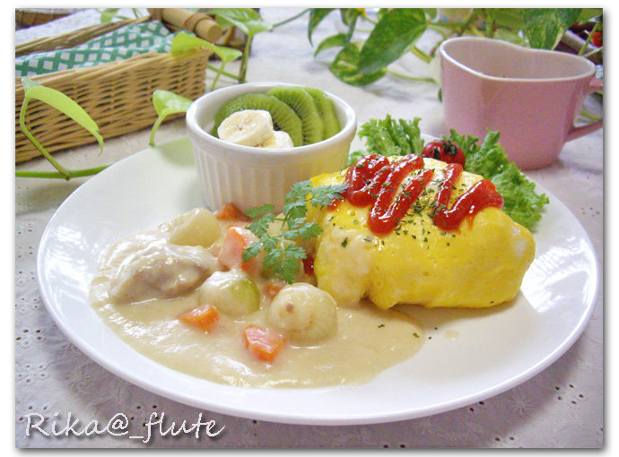 オムライス、クリームシチュー添えハローデイ レシピサイト。