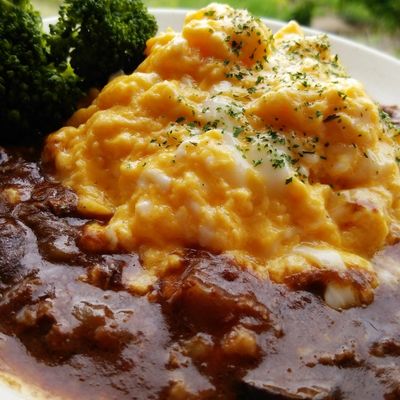 写真付きでレシピを再現! 畑薙 はたなぎ ダムビーフシチューオムハンバーグライス今日も通ハンバーグ。