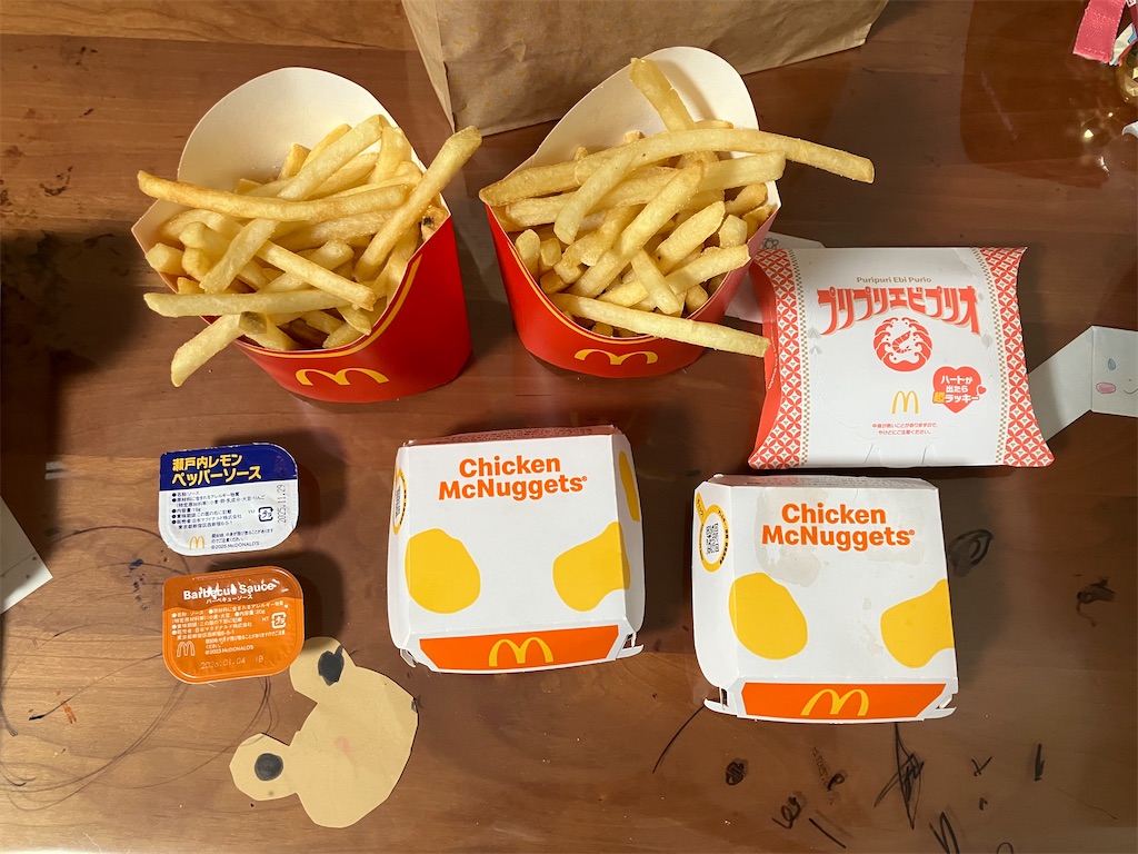 今夜はジャンキー・ナイトたまぁ〜には、マックもいいねー ホワイトホースのハイボールに、ポテトフライは🍟超最高! ナゲットはポケモンBOXだぁ!ガーリック&チーズソースが、めっちゃ旨い! ハイボールが進むなぁ。 やはり、夜マック ポテナゲ特大 960円 は最強。