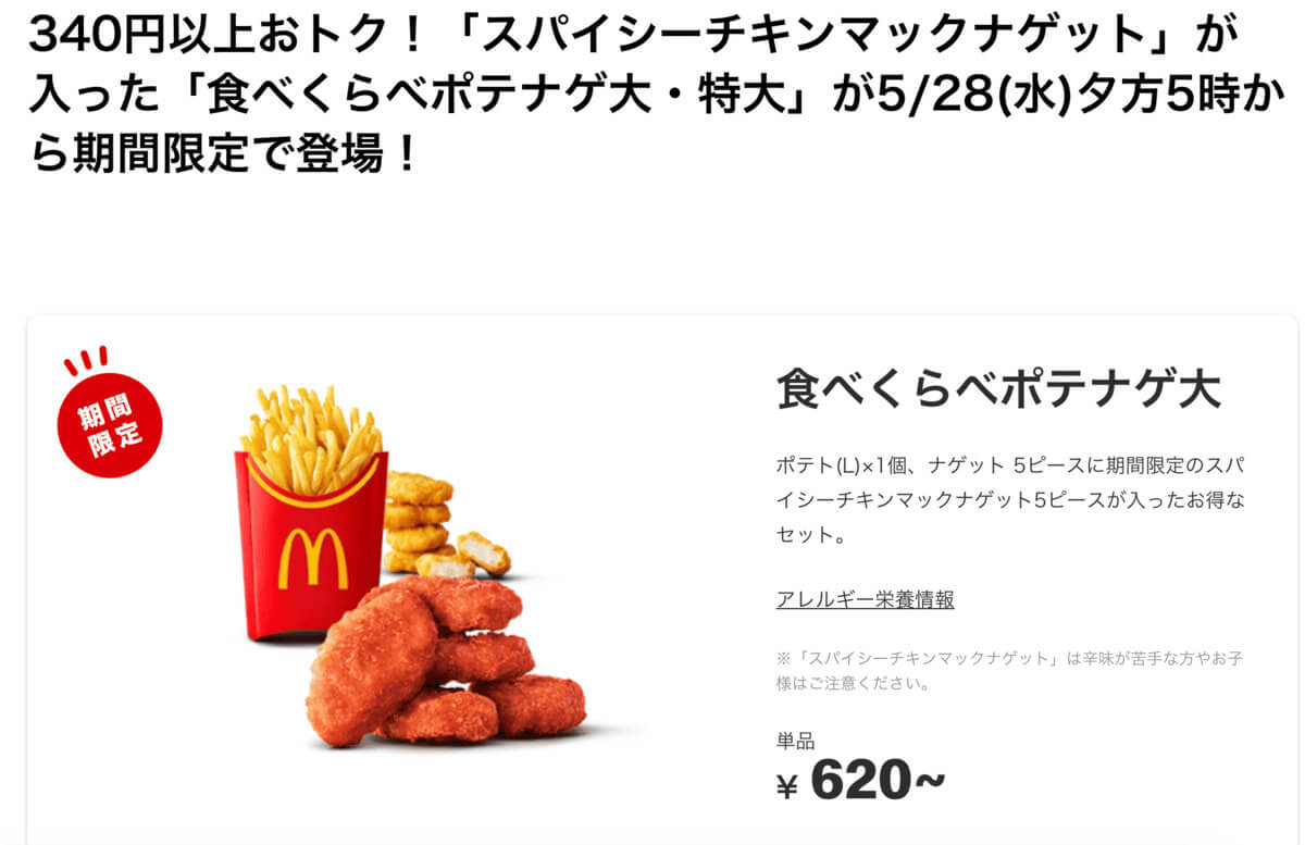 マクドナルドからスパイシーチキンマックナゲットの「食べくらべポテナゲ大・特大」が新登場!最大590円以上お得です -新商品・新発売情報 進撃のグルメ。