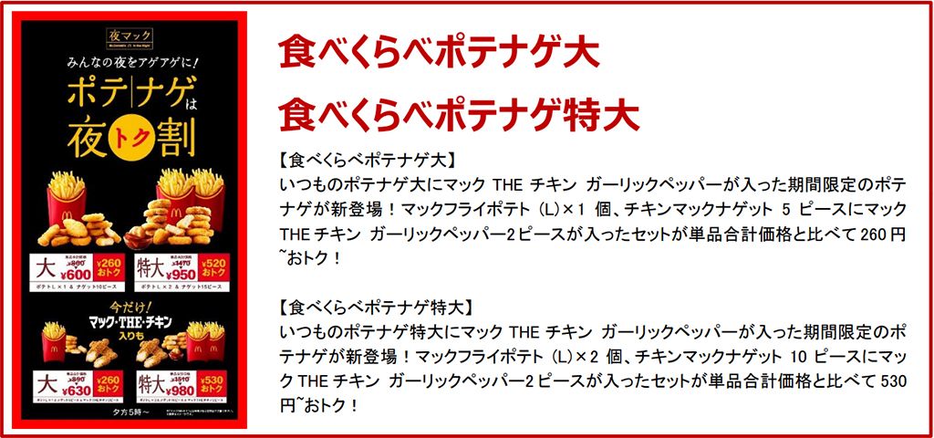 9 18 水 から期間限定で登場!¥280以上おトク!「食べくらべポテナゲ」お知らせ日本マクドナルドフランチャイジータビーコーポレーション株式会社。