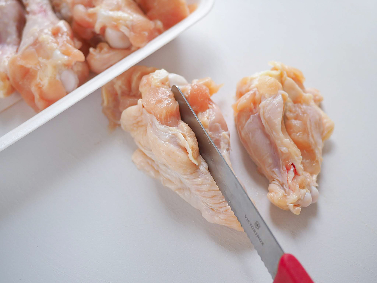 手羽先の先の部分を切り離す下ごしらえのきほん 肉・卵オレンジページnet。