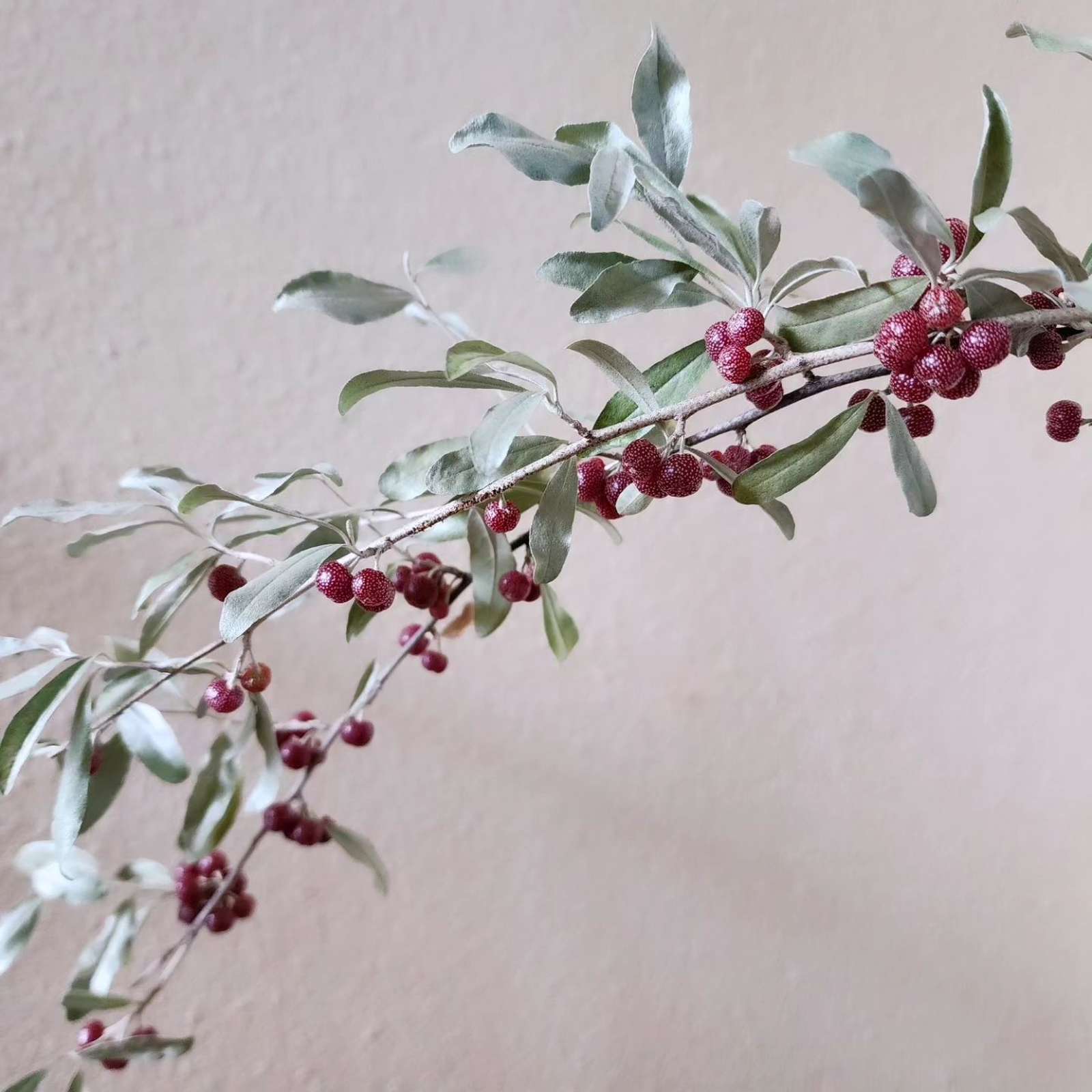 ベランダで育ててるロシアンオリーブに赤い実がたくさんついたのでテーブルにも少し飾りました。ジャムにしたりして食べれるそうです😊 .ロシアンオリーブ猫と暮らす猫のいる暮らし暮らし 日々のこと。