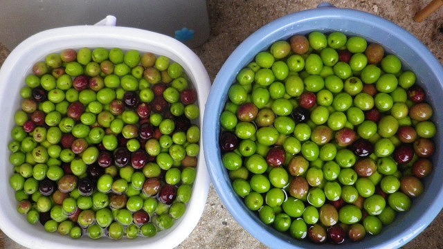 採れたてのオリーブの実がビックリするほど届いたので、, ., 早速塩漬け作業に、, ., 品種は、, ルッカと、ミッションの2種類、,我が家のオリーブの木はあなあきゾウムシという害虫の被害で数年前に枯れてしまい、17年くらい伸び伸びと育った大きな木で2本植えてはいたのですがなかなか実がつかずでした、,。