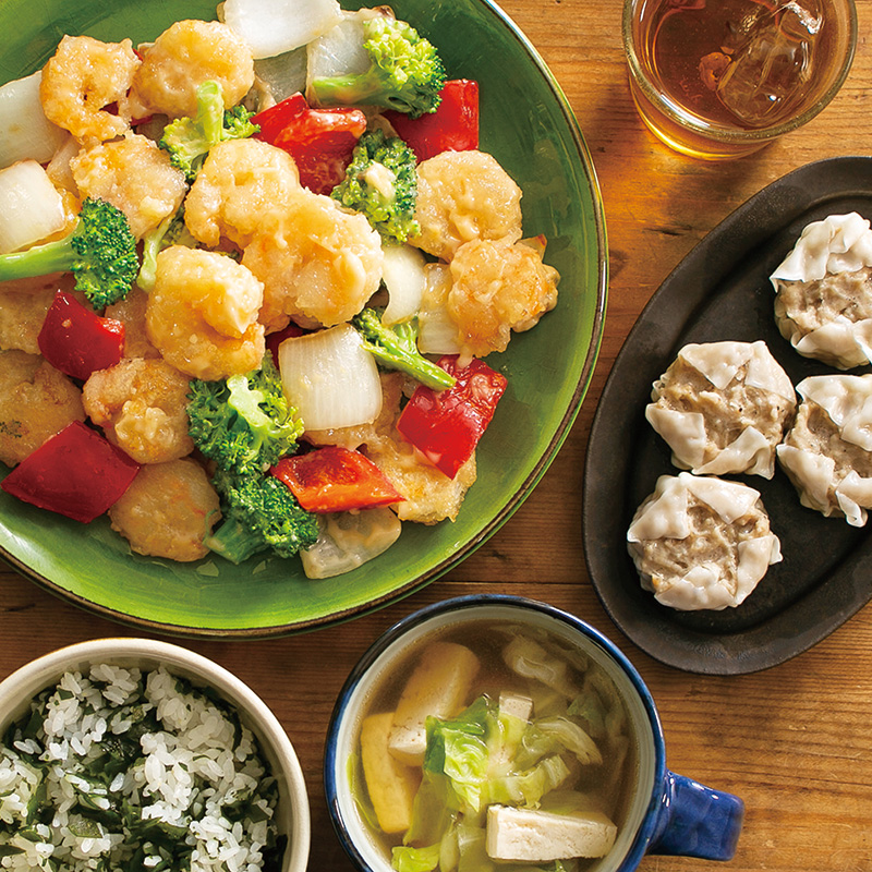 「野菜がとれるエビマヨ」、「帆立干し貝柱焼売」、キャベツと豆腐の中華スープ、わかめごはん 3人分。