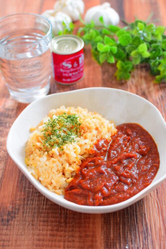 余ったミートソースのリメイク♪ガーリックライスキーマカレーのレシピ。