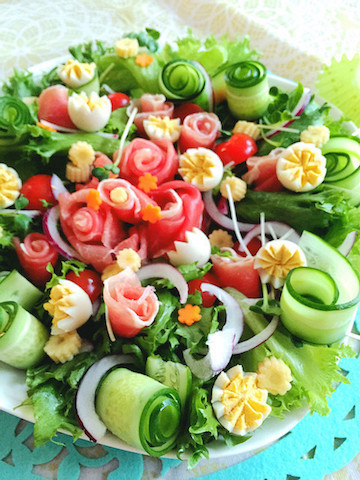 ブーケサラダの盛り付け方 生ハムときゅうりを巻いてお花に見せるサラダの花束。