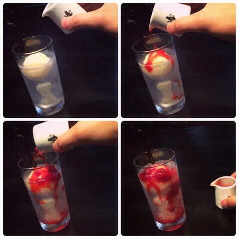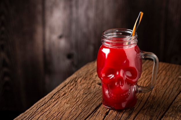 ハロウィンドリンク。スカルグラスの血の飲み物。Premium写真。
