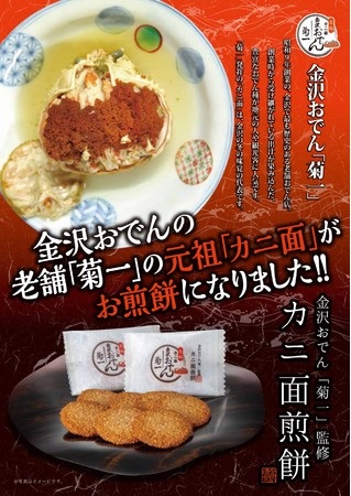 金沢おでんの看板メニュー“カニ面”が煎餅で味わえる! 香箱ガニ ズワイガニのメス の甲羅の内側にカニ一杯分の身、カニ みそ、内子、外子を詰めて出汁に漬け込んだ“カニ面”。その発祥の老舗おでん屋“菊一”さんが監修。 口の中でサクサクと崩れて、噛むごとにジワッと“カニ。