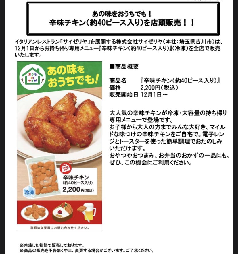 マキタニさん🇮🇹サイゼリヤはちゃんとおいしい on X: "サイゼリヤで今日12 1から、冷凍の「辛味チキン」を販売だそうですよー ・冷凍・約40ピース ・2,200円 ・全店で販売 クリスマスシーズンにチキン。これは店舗側は工数小さくテイクアウト販売できるよね。店内用在庫。