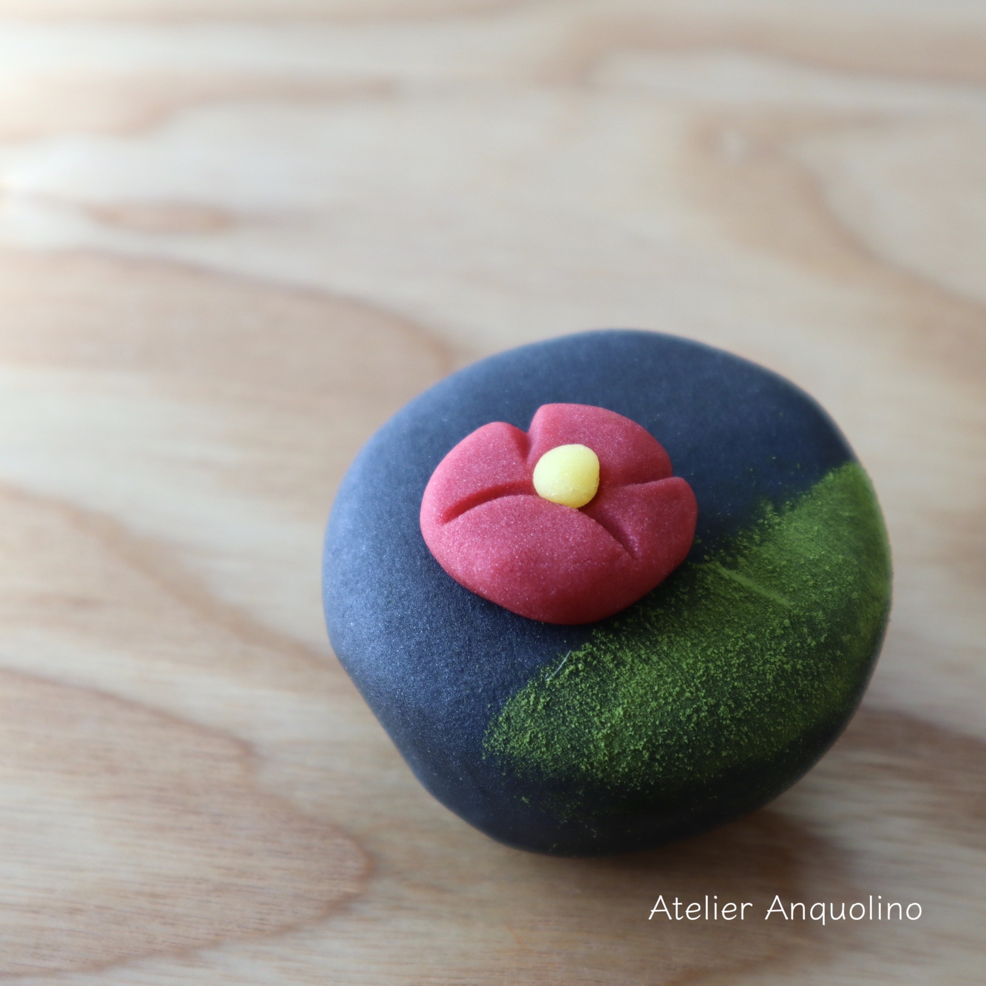 冬に鮮やかな花をつける椿。練り切りで表現してみました。アトリエ・アンコリノ。