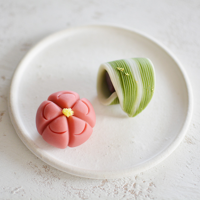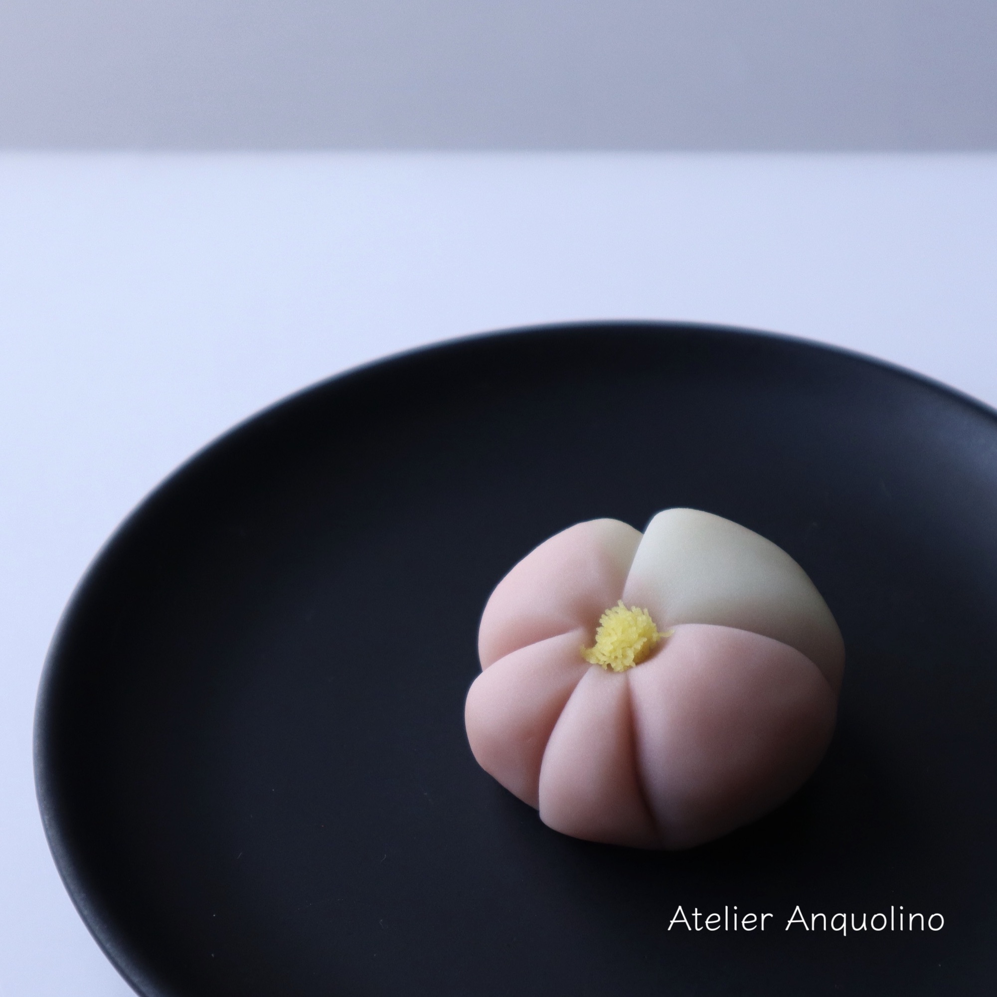 梅の練り切りです。かさねの色目「雪ノ下」の配色で作りました。アトリエ・アンコリノ。