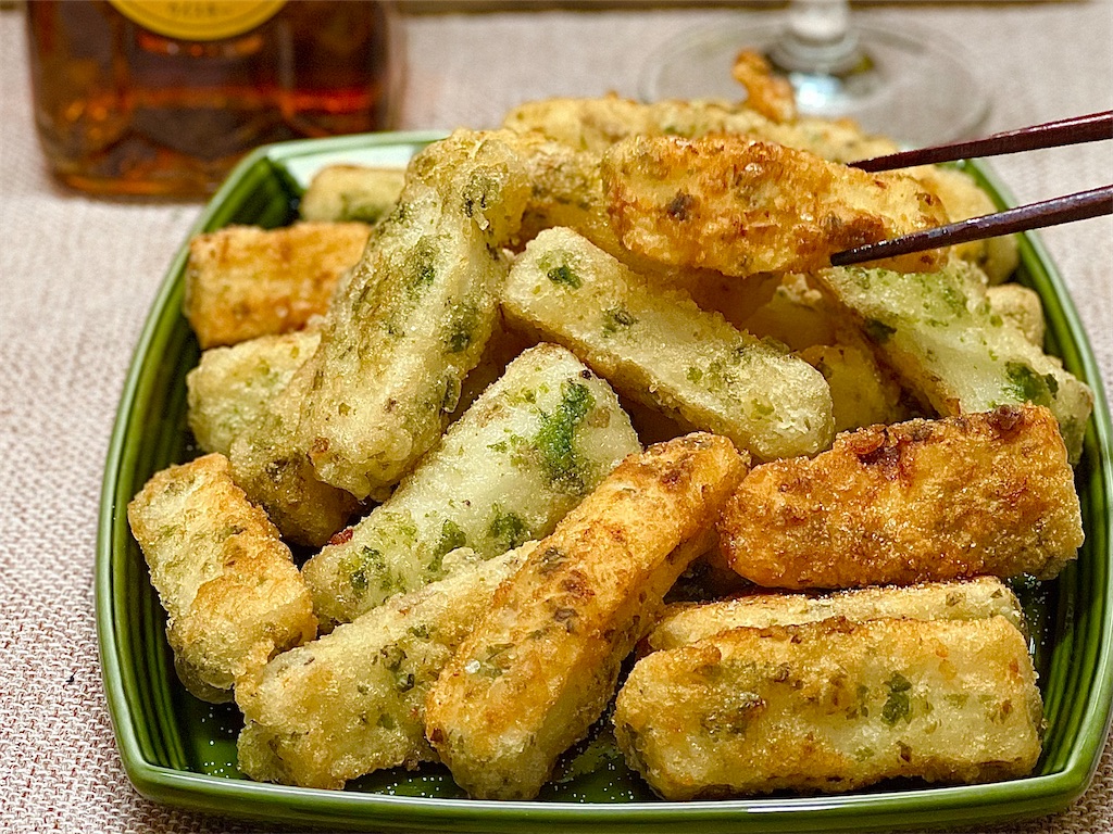 背徳山芋フライ",材料 , ・山芋 200g , ・塩胡椒 適量 , ・めんつゆ 小さじ1 , ・片栗粉 大さじ2 ,・オリーブオイル 大さじ4 , ・バター 1片 , ・ブラペ 適量 , ・あおさ 大さじ1 , ・パルミジャーノ 大さじ2 ,山芋 レシピ 晩酌 おつまみ ハイボール。
