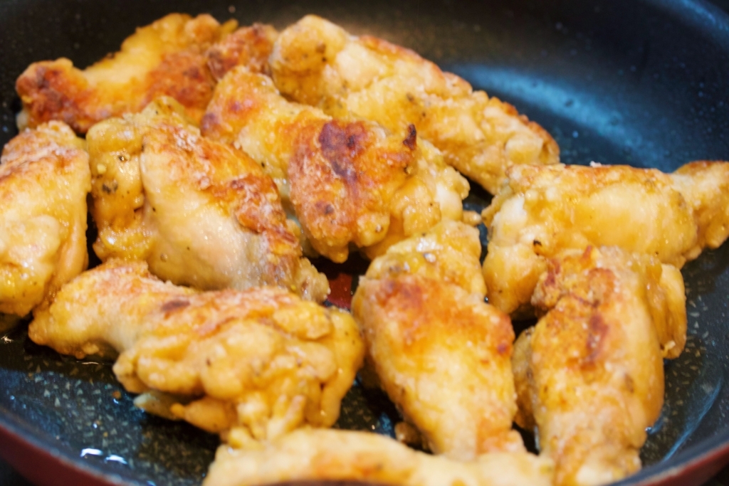 簡単油1cmフライパンで手羽元唐揚げフライドチキン。