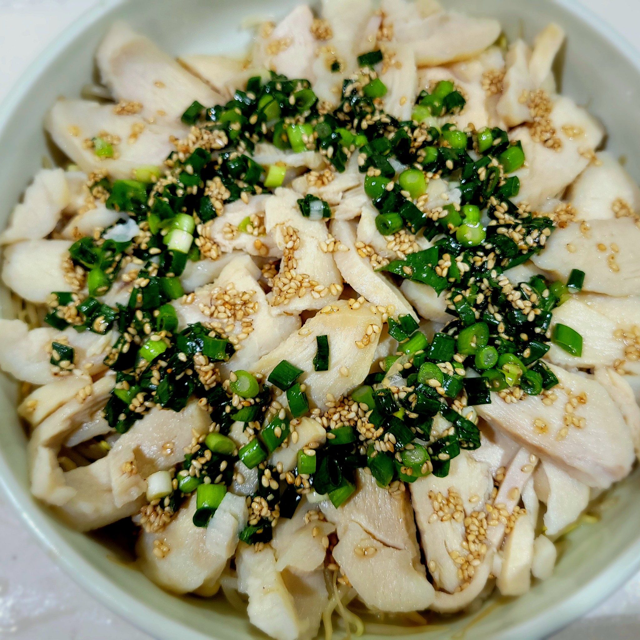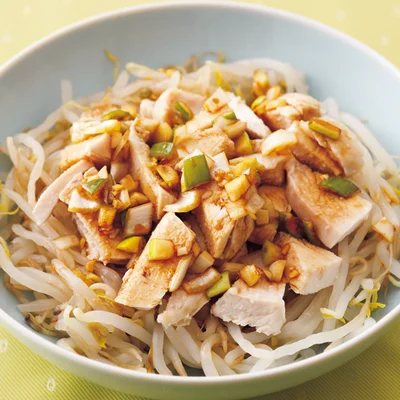 レンジで!しっとり蒸し鶏とたっぷりもやしのやみつき旨だれ。