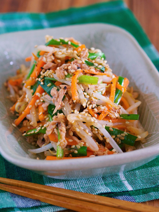 もやしとにらのフライパン蒸し『レンチンスタミナだれで旨うま』。