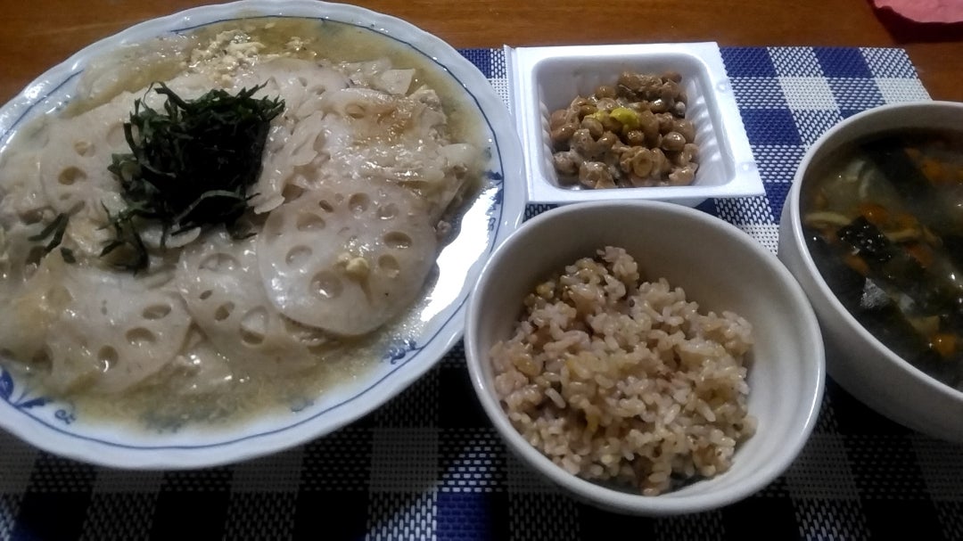 夜ごはん レンコンと豚ひき肉のかさね蒸しと昆布タマネギのなめこ汁健康おやつ道場。