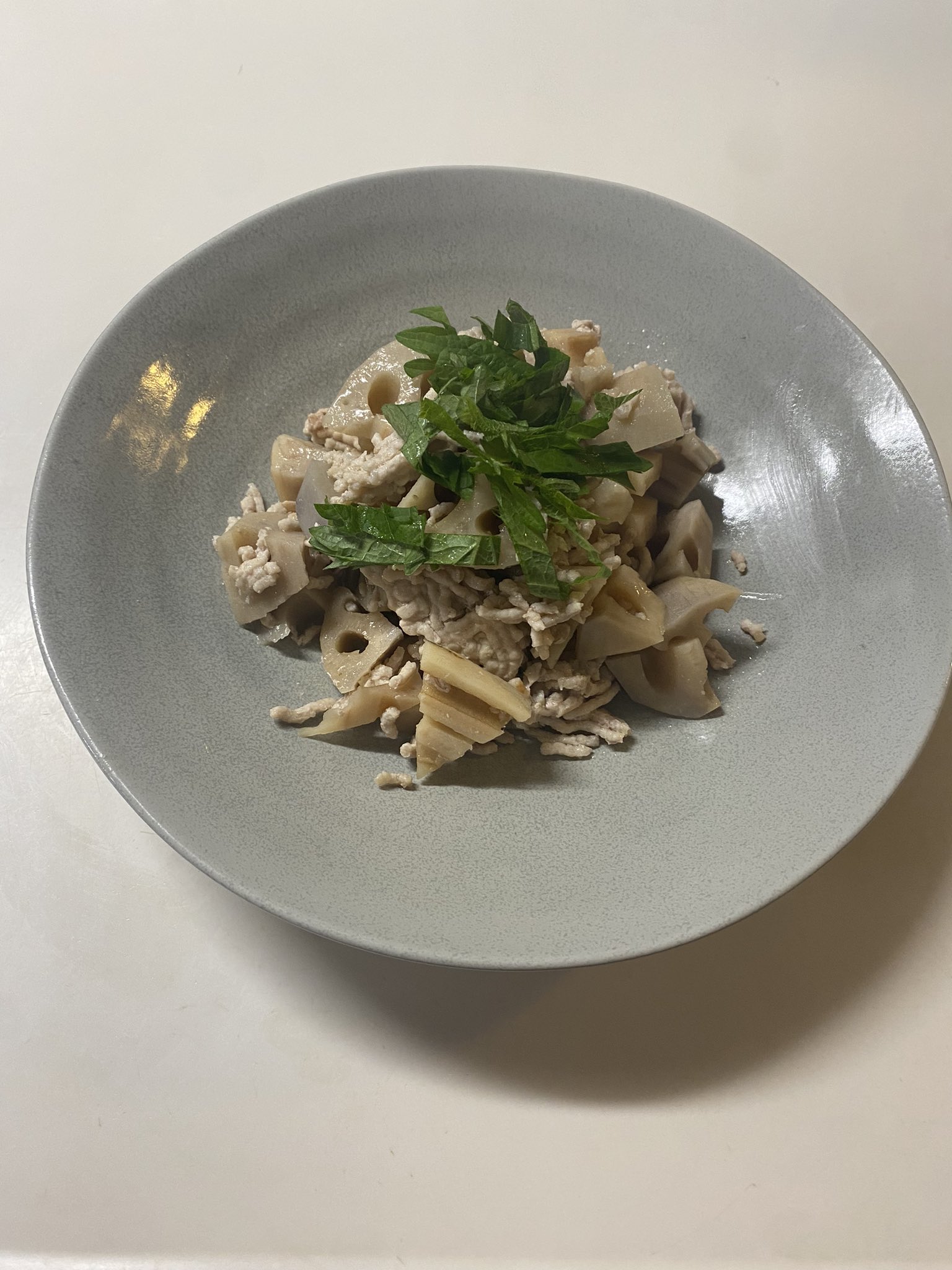 自作、夕食。レンコンと豚ひき肉の大葉レモン蒸し長谷川あかり レンコンがシャキシャキして旨し☺️。