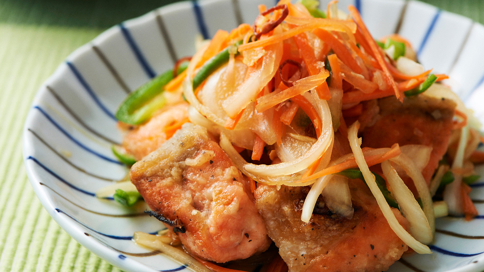 揚げずに作る、鮭の南蛮漬けのレシピ 作り方:白ごはん.com。