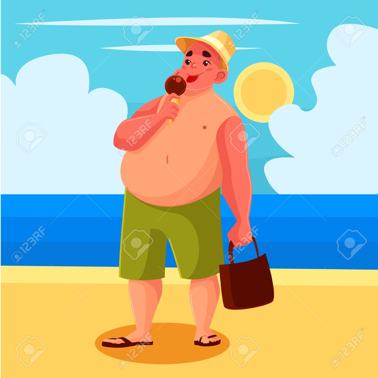 ベクトル漫画漫画イラスト、ビーチで食べるデブ男アイスクリーム一人の男、甘いアイスクリーム ビーチで休日、海とデブ男と太陽が降り注ぐビーチ バカンスの イラスト素材・ベクター Image 57012505。