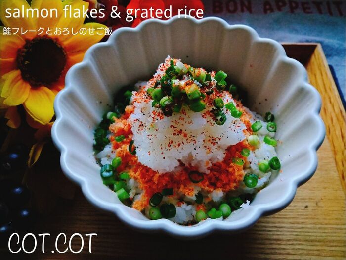 ★食べても罪悪感なし⁉温かいお茶をかけてさっぱりさせても‼鮭フレークとおろしのせご飯★。