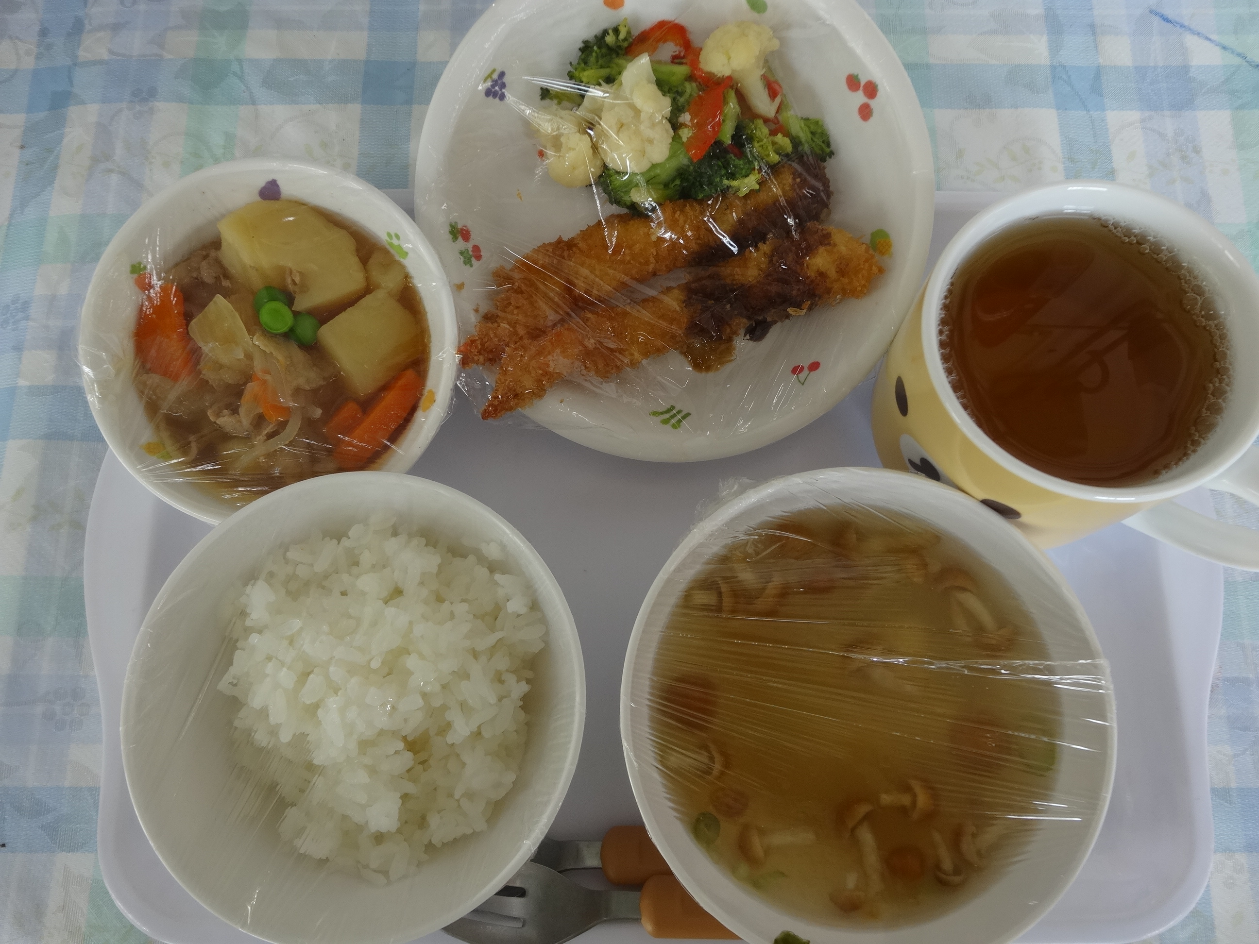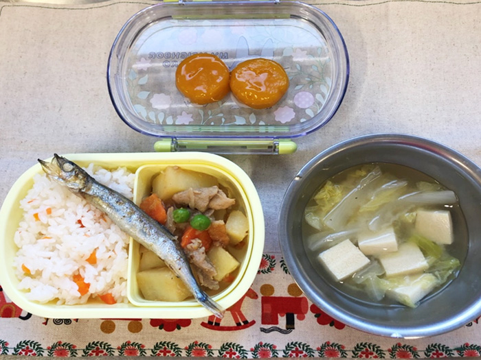 人参ご飯、味噌汁、ししゃも、肉じゃが、南瓜団子給食の献立学校法人帯広竜谷学園 認定こども園 帯広幼稚園。