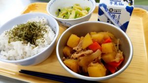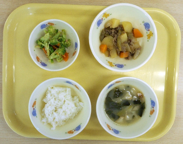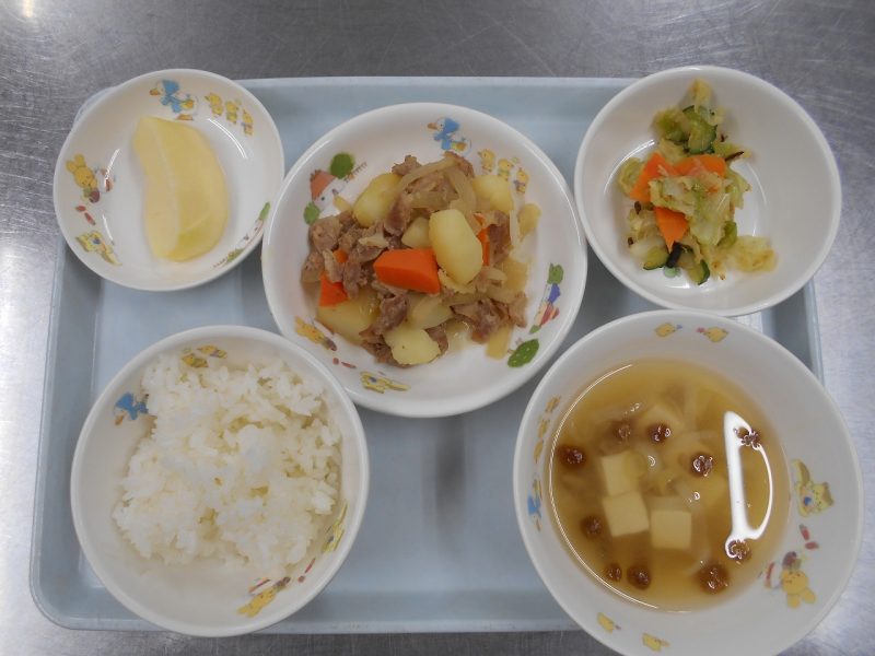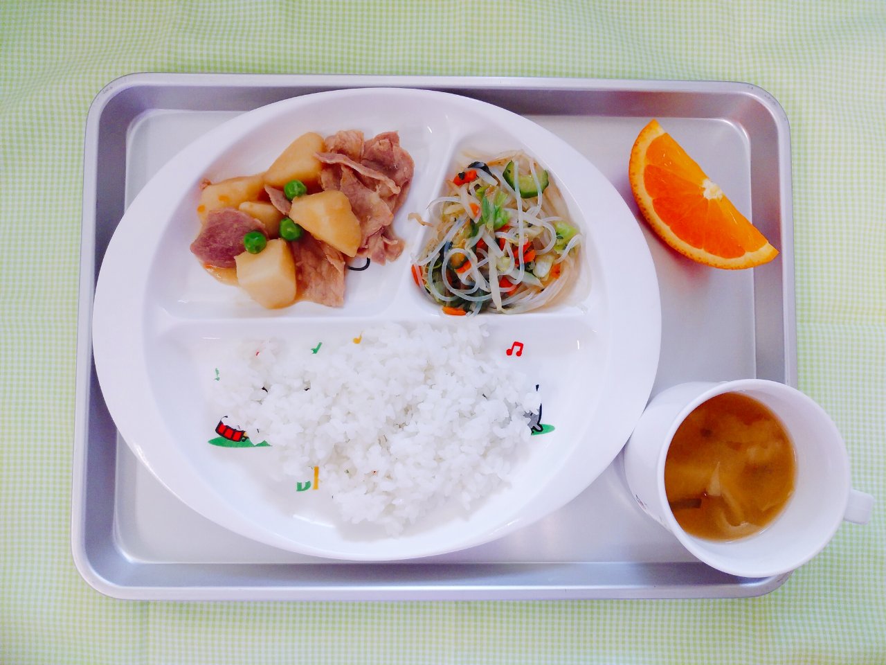 ごはん、キャベツの味噌汁、肉じゃが、春雨の和風サラダ、オレンジ – 聖徳大学附属浦安幼稚園。