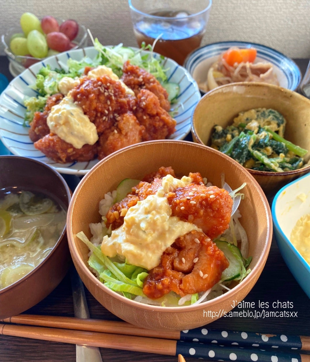 夕飯献立 無水肉じゃがと王将焼売・チキンケチャップ丼&新玉とろ玉タルタルがけおつまみ子供ごはんJ'aime les chats☀お弁当ごはん。