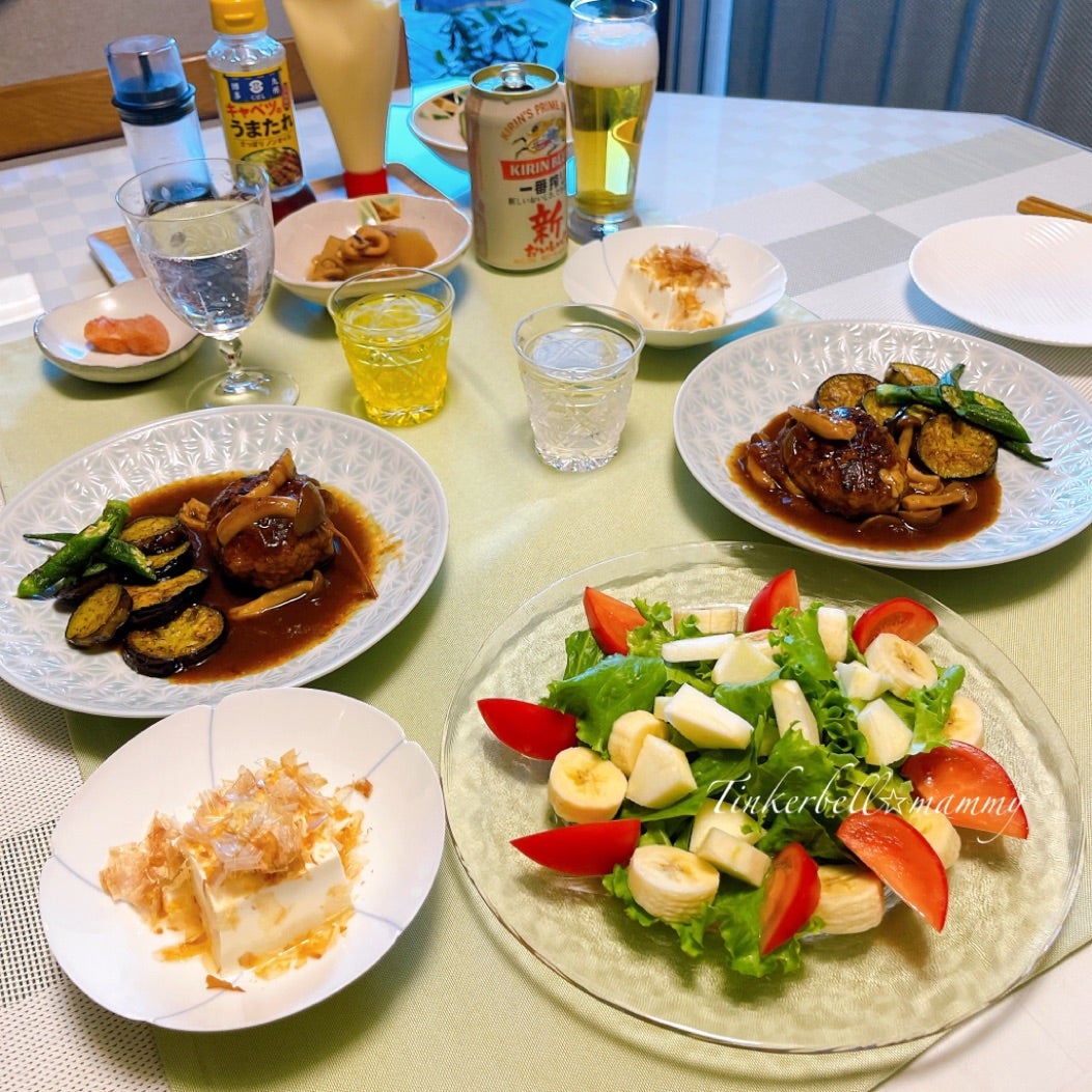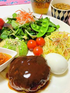 盛り付けがイマイチなハンバーグの晩ごはんいつも心にハワイなの~♡。