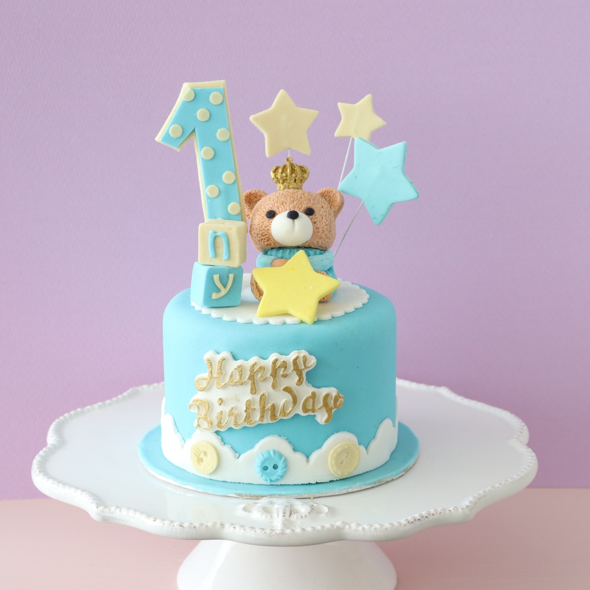 バースデーケーキに、2段のブルーナッペケーキでご指定のイラストと立体をトッピング大阪市東住吉区パティスリーデコ。