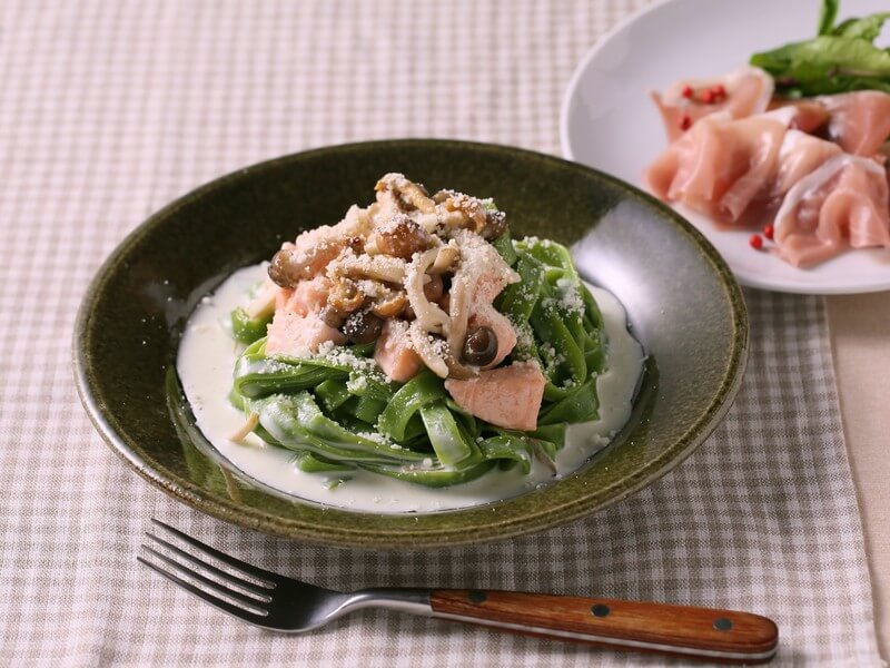 サーモンとキノコのクリームソースほうれん草のフェットチーネ生パスタ製造・業務用卸・ご家庭向け販売のニューオークボ。