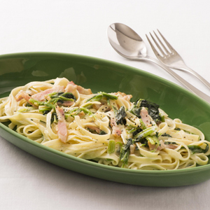 ベーコンとほうれん草のフィットチーネレシピマーガリン・チーズ・ホットケーキの通販・ギフトアレルギー対応製品ありマリンフード。