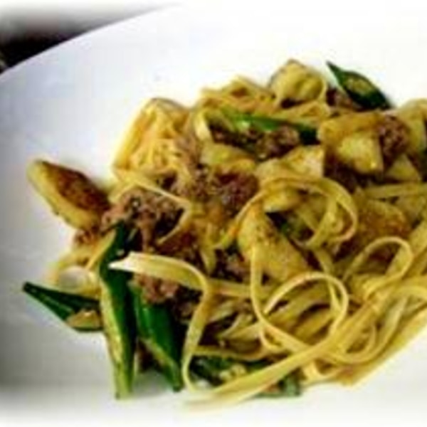 湯葉とオクラのフェットチーネで冷製和風パスタ これうまつゆと辣油で絶品 とんちんSnapdish スナップディッシュID:iTCS1a。