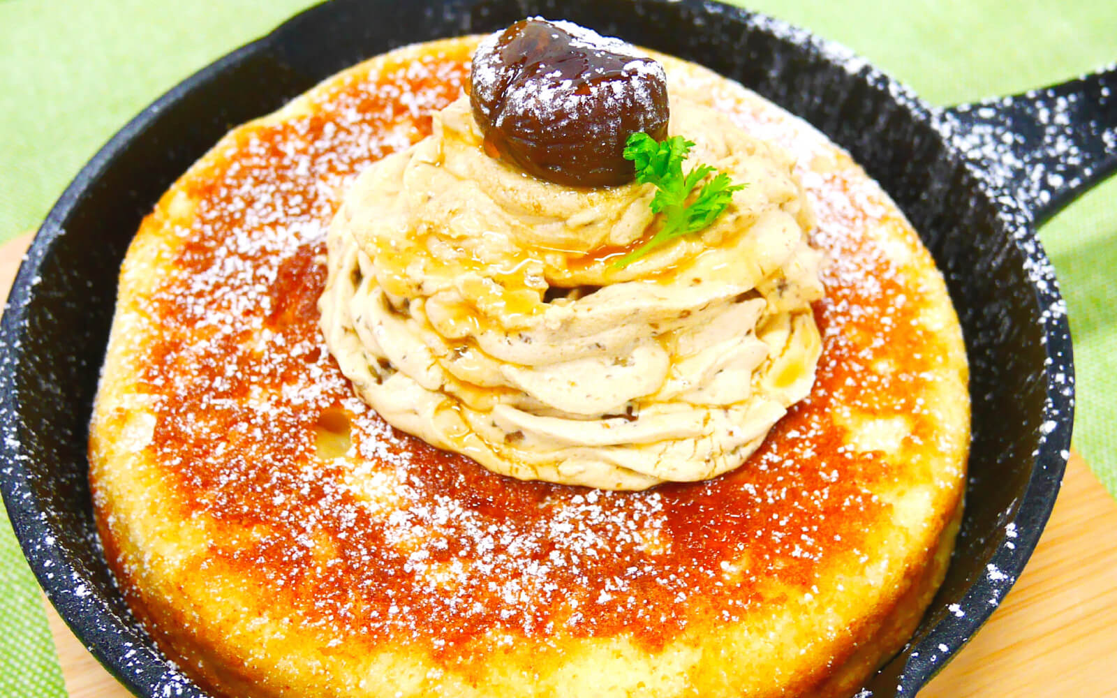 甘栗むいちゃいましたアレンジレシピ<スイーツレシピ> 栗の粒つぶ入りモンブランクリームのパンケーキ クラシエ。