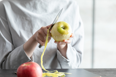 部屋の中でりんごの皮を剥く若い女性の手元の写真素材FYI04300833ストックフォトの Qlean Market キュリンマーケット。