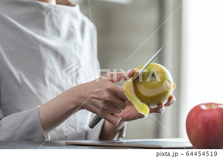 部屋の中でりんごの皮を剥く若い女性の手元の写真素材64454519- PIXTA。