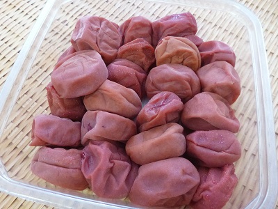 梅干し 天日干し後 日焼けして赤くなってます。 今年は梅の収穫量が少なかったので干すのも少なくて楽でしたが・。 嬉しくない楽です。これから梅酢に戻して、3か月以上置きます。塩の角がとれてなじむまで。 紫蘇ができたら紫蘇を入れます。 昨年仕込んだものが。