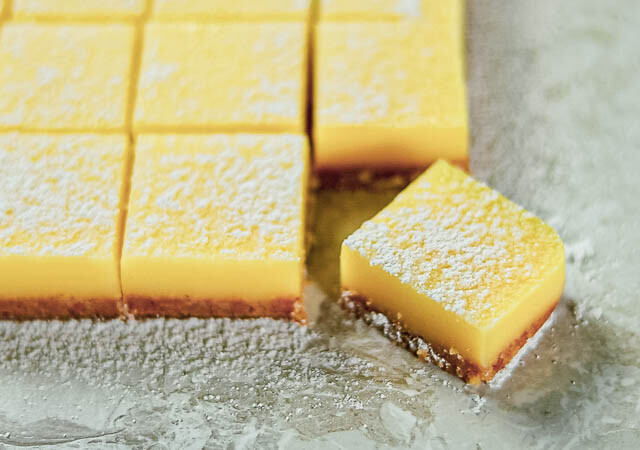 型に入れて固めるだけ♪サクサクビスケットと自家製レモンカードで作る爽やかレモンスクエア。