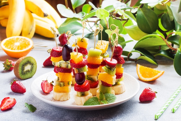 串に刺した新鮮な果物。夏のパーティーのためのコンセプトビュッフェ。Premium写真。